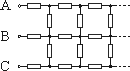 trojitého nekonečného rebríka odporov. Každý z odporov má hodnotu $R = 1 \, \Omega$.