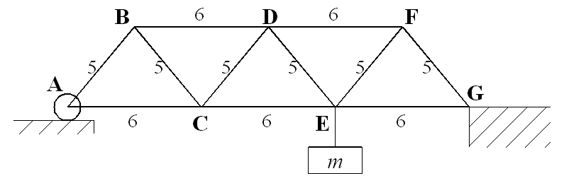 Katka si medzi poličkou a stolom postavila most. Most je tvorený ľahkými tyčami voľne spojenými kĺbmi, tak ako na obrázku. Dĺžky šikmých a vodorovných tyčí sú v pomere 5:6. V bode E je zavesené závažie s hmotnosťou $m$. Ktoré tyčí môže Katka nahradiť ohybnými väzbami, t.j. napríklad pevným špagátom rovnakej dĺžky? Akou silou je namáhaná tyč BD?