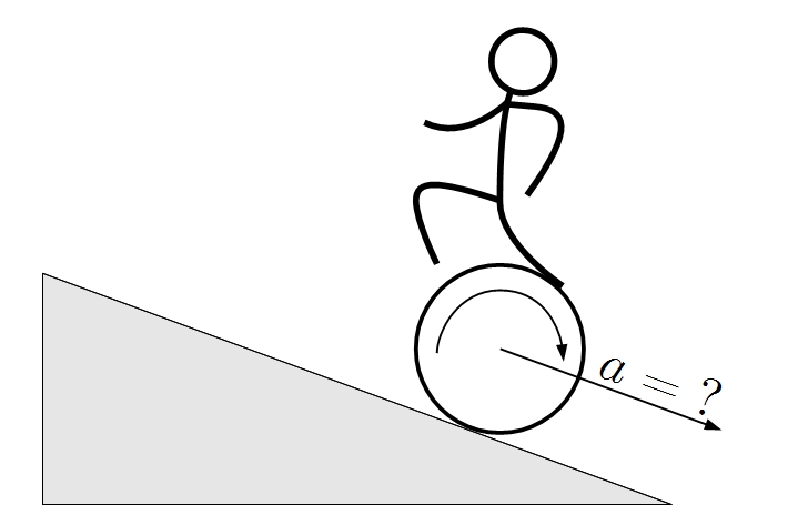 Paťo (s hmotnosťou $m$) trénuje cirkusové vystúpenie. Jeho kúsok spočíva v tom, že sa postaví na prázdny sud (s hmotnosťou $M$ a momentom zotrvačnosti $MR^2$) a nechá ho kotúlať sa dolu naklonenou rovinou so sklonom $\alpha$. Paťo pritom po sude beží tak, že sa stále nachádza na jeho najvrchnejšom bode. Zistite, s akým zrýchlením sa za týchto okolností sud kotúľa. Predpokladajte, že sud na podložke neprešmykuje!