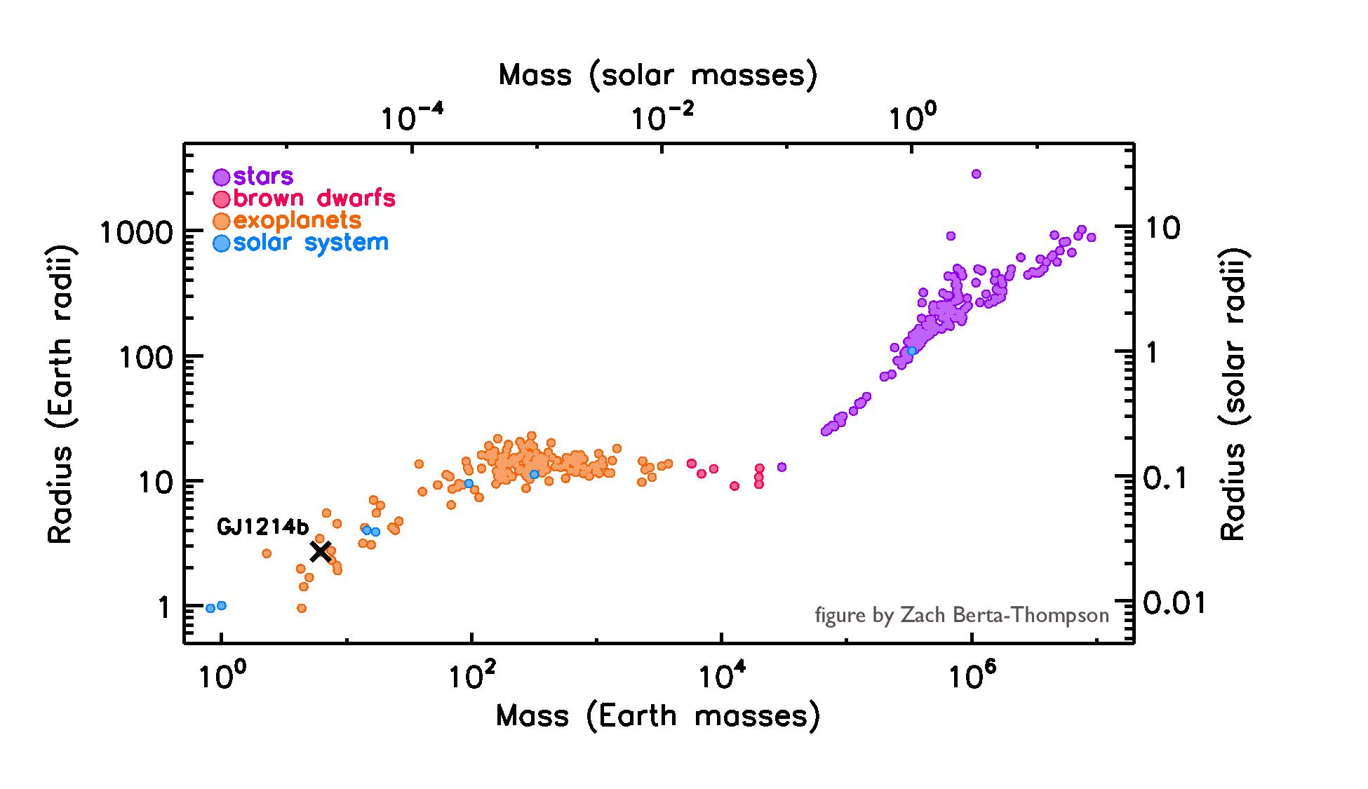 Nasledujúci graf znázorňuje v logaritmickej škále hmotnosť a polomer vesmírnych objektov doposiaľ objavených tranzitnou metódou. Zahŕňa terestriálne planéty, plynových obrov, hnedých trpaslíkov a hviezd.